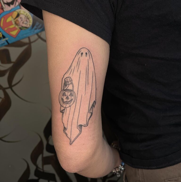 This tattoo features a ghost draped in a white sheet, a nod to the classic Halloween costume. The sheet often has eye holes cut out, adding to the nostalgic and humorous aspect of the design.